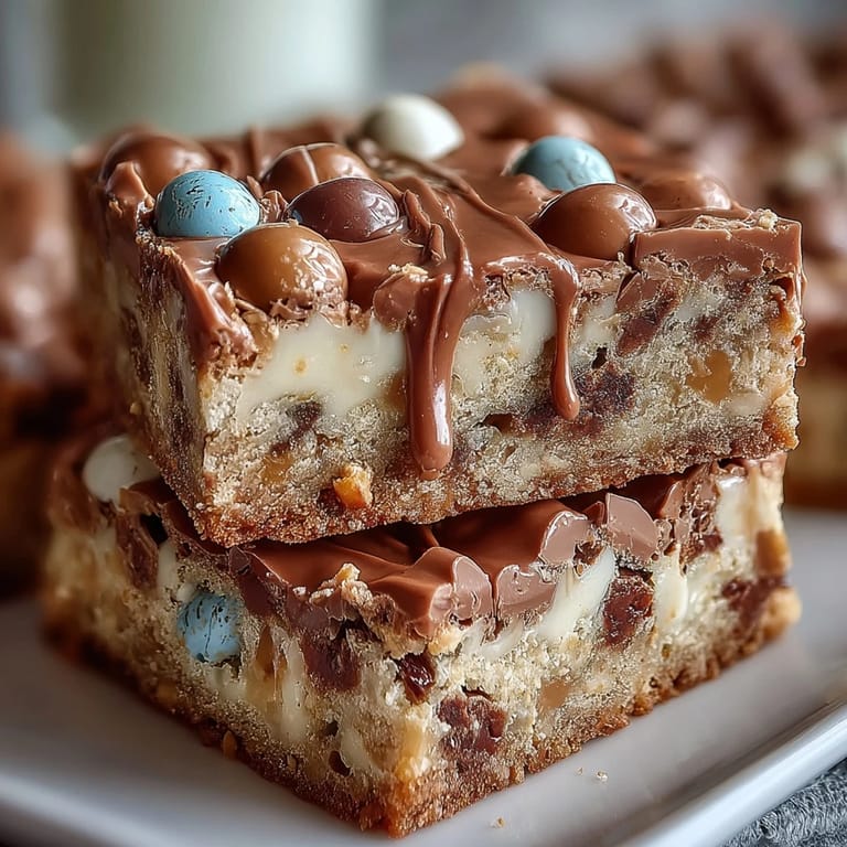 Pin It My sister called me in a panic three days before Easter, asking if I could bring something to her house that screamed spring without requiring a fancy technique. I'd been scrolling through my pantry that morning, staring at a bag of Cadbury Mini Eggs leftover from the kids' baskets, when inspiration struck. Blondies felt right—golden, chewy, forgiving enough to pull off with minimal fuss. That first batch came out of the oven while she was still on the phone, and I drizzled white chocolate over them warm, watching it cascade like sweet ribbons. The smell alone told me I'd made the right call.