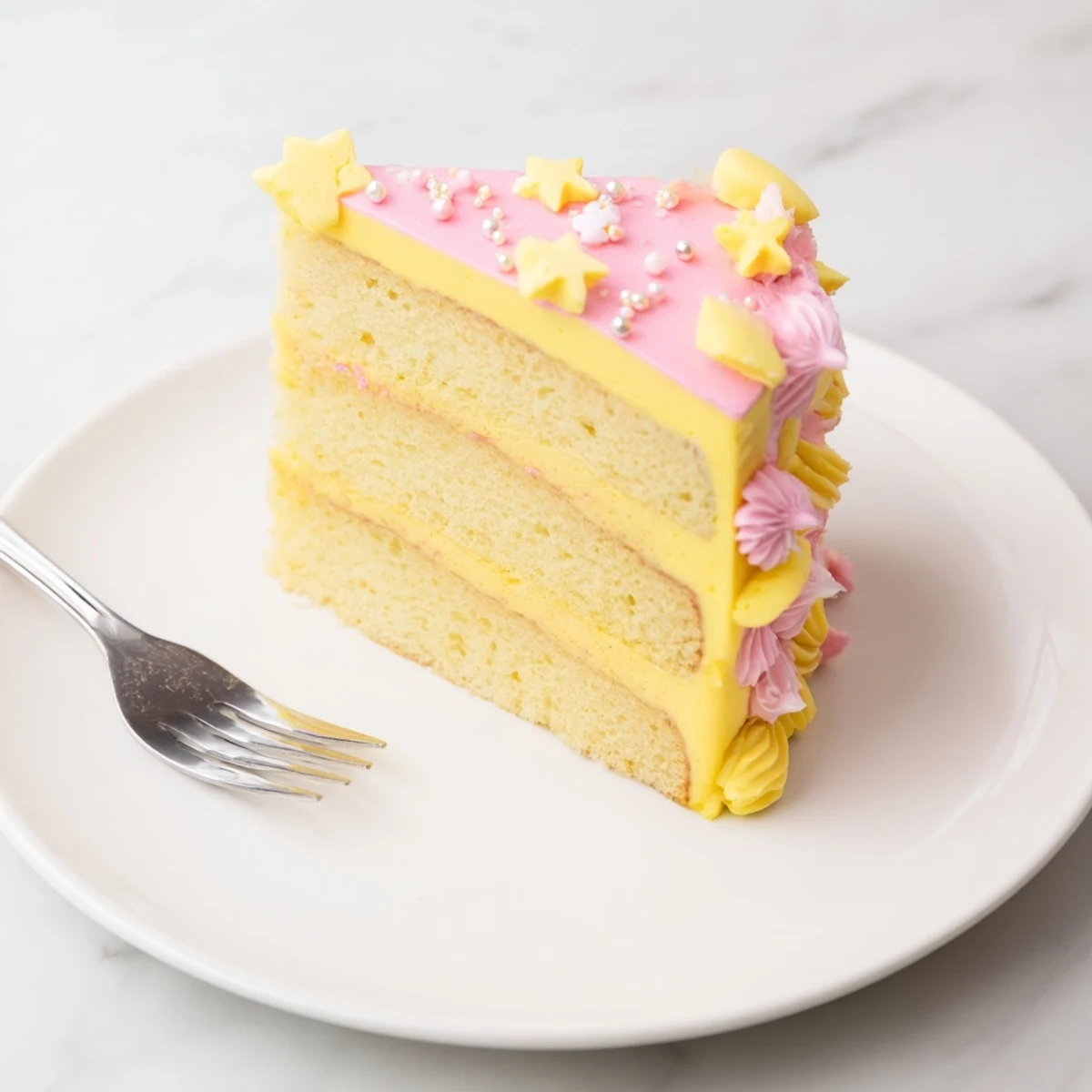 - Level cake layers if needed. Place one layer on a serving plate and spread with pink buttercream. Top with the second layer frost the entire cake with yellow buttercream.