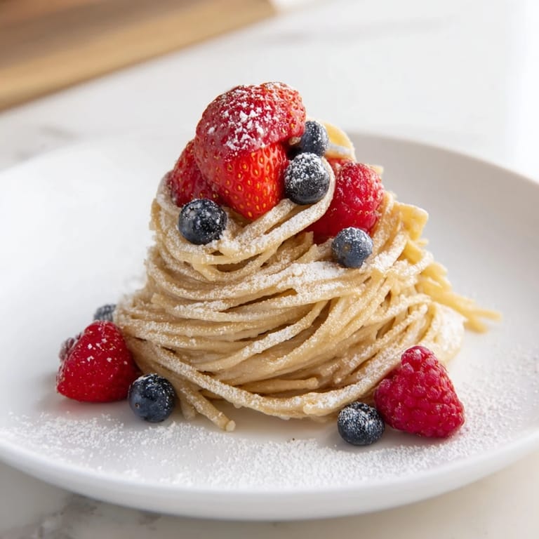 Pin It Quick Festive Pancake Spaghetti offers a delightful spin on traditional pancakes, transforming light, fluffy batter into whimsical spaghetti-like strands. This playful dish brings a festive touch to your breakfast or brunch table, topped with a vibrant medley of fresh berries and a gentle dusting of powdered sugar. Perfect for gatherings or holiday mornings, it combines fun presentation with comforting flavors.