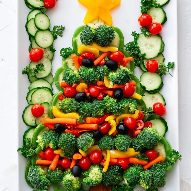 Pin It A festive and colorful vegetable platter arranged in the shape of a Christmas tree, perfect for holiday gatherings. Nutritious, eye-catching, and easy to assemble.