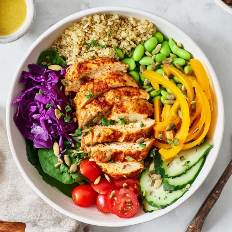 Pin It A vibrant, nutrient-packed meal featuring colorful vegetables, wholesome grains, lean protein, and a zesty dressing, designed for easy meal-prep and beautiful presentation.