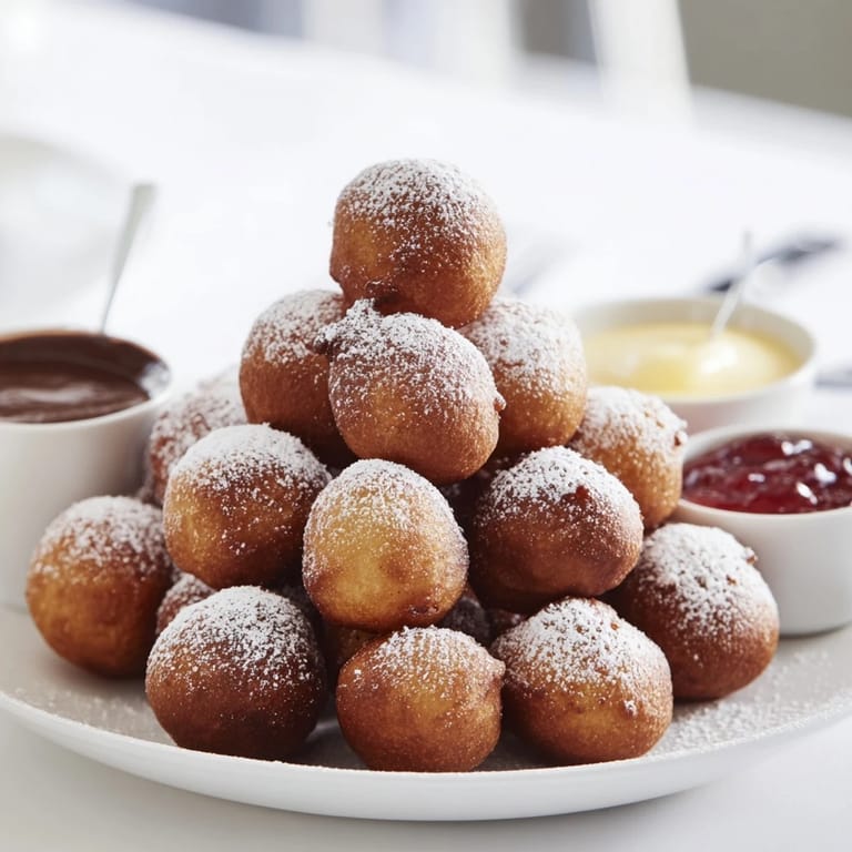 Pin It A whimsical dessert platter featuring a towering mountain of soft, pillowy donut holes, generously dusted with powdered sugar and served with assorted dipping sauces for a delightful treat.
