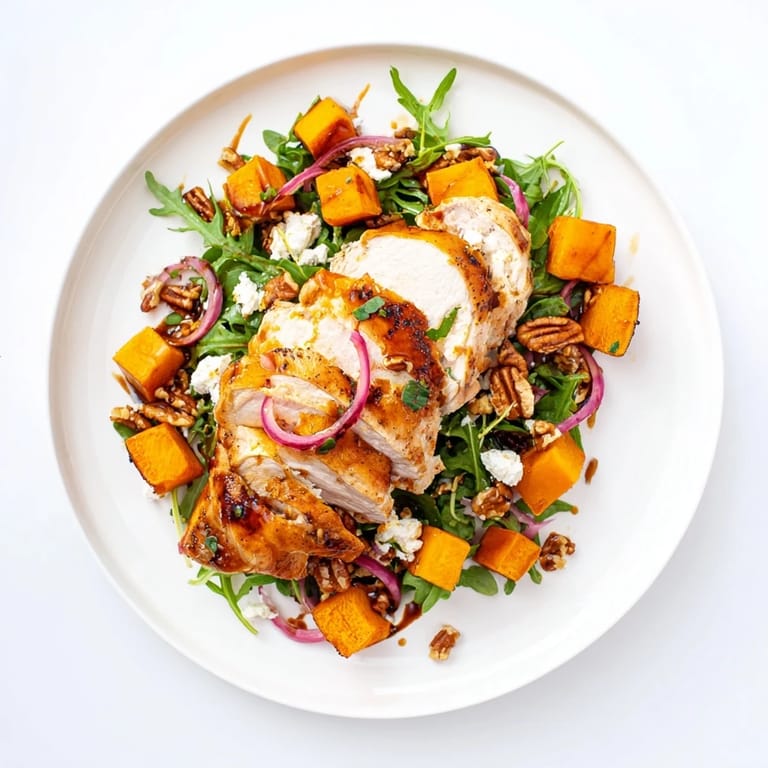 Pin It A hearty, vibrant salad featuring juicy roasted chicken, caramelized winter squash, and crisp greens baked on a single sheet pan for easy prep and clean-up. Perfect for a cozy, flavorful meal.