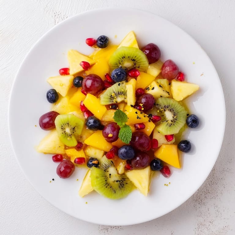 - Fresh Fruits: 1 small pineapple peeled cored and cut into bite-sized pieces, 2 ripe mangoes peeled and sliced, 1 cup red grapes halved, 1 cup green grapes halved, 2 kiwis peeled and sliced, 1 large pomegranate seeds only, 1 cup blueberries