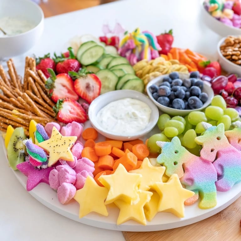 Pin It A whimsical and colorful party platter featuring a delightful array of sweet and savory treats, perfect for enchanting any celebration with a magical unicorn theme.