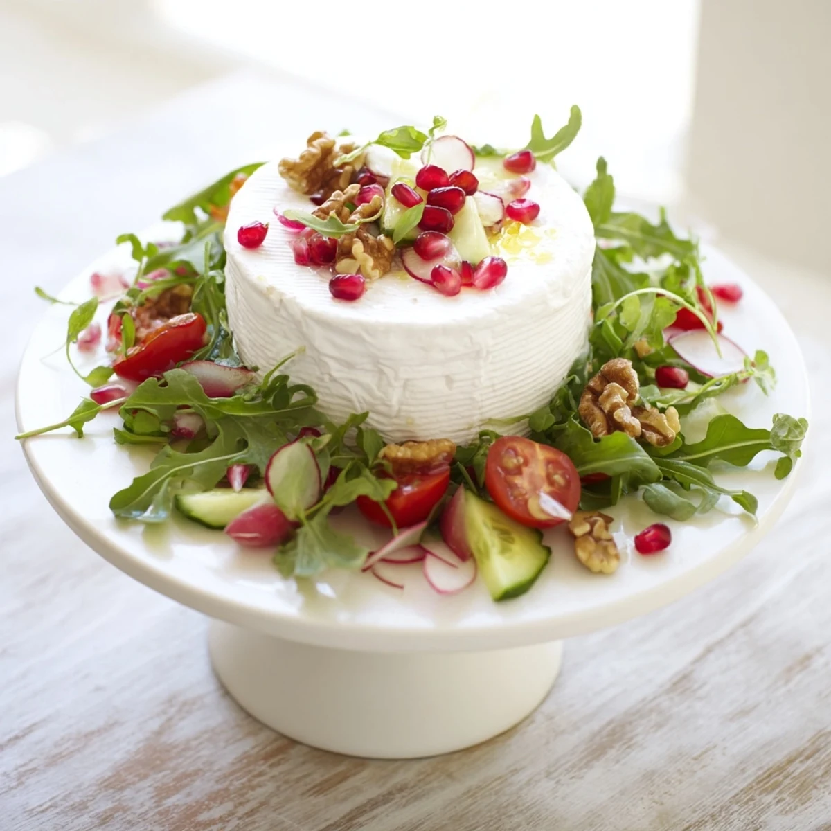 A striking salad combining arugula, tomatoes, walnuts, and a rich cheese centerpiece in a fresh arrangement.