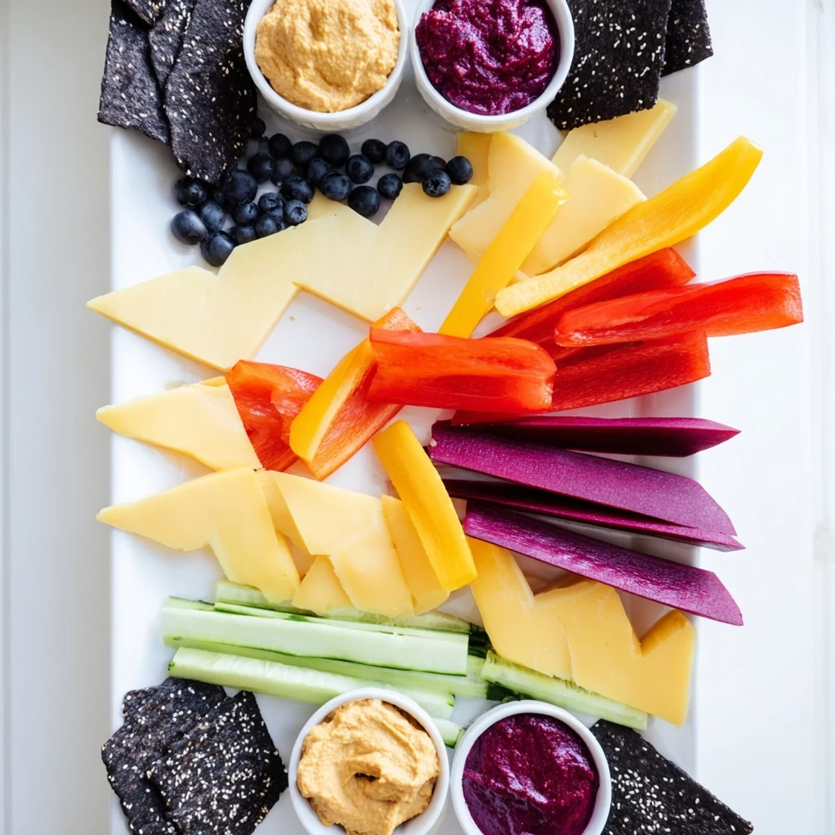 - Blue corn tortilla chips and black sesame rice crackers: Crunchy elements that frame the whole arrangement. The colors amplify the contrast, and they're sturdy enough to scoop dip without falling apart (usually).